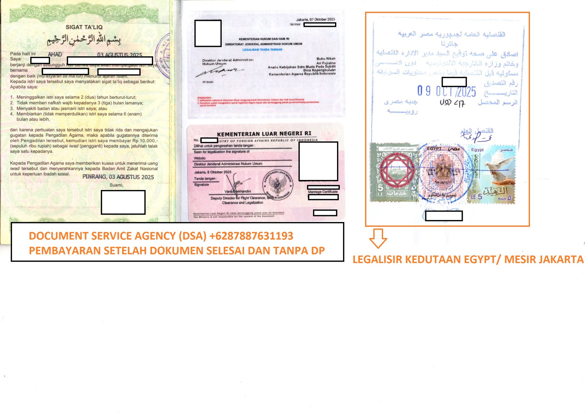 DSA (Document Service Agency) adalah spesialis jasa terjemah, legalisir, atestasi, apostile dokumen untuk keperluan di luar negeri dan pengurusan visa berpengalaman dan terpercaya. Bagi anda yang ingin melegalisir buku nikah di Kedutaan Mesir untuk keperluan pengurusan visa, izin tinggal, pendaftaran pernikahan dan lain-lain. Anda tidak perlu datang ke Jakarta karna pengurusan dokumen anda bisa diwakilakan kepada kami, dengan layanan ” Pembayaran Setelah Dokumen Selesai dan Tanpa DP ” membuat anda lebih nyaman dan aman menggunakan jasa kami.