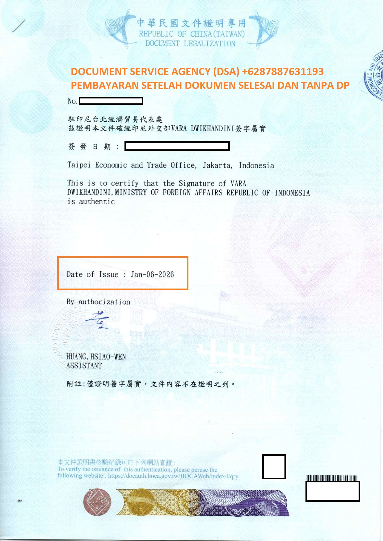 DSA (Document Service Agency) adalah spesialis jasa terjemah, legalisir, atestasi, apostile dokumen untuk keperluan di luar negeri dan pengurusan visa berpengalaman dan terpercaya. Bagi anda yang ingin melegalisir buku nikah di Kedutaan Taiwan untuk pengurusan visa, izin tinggal, pendaftaran pernikahan dan lain-lain. Percayakan legalisir dokumen anda kepada kami, dengan layanan ” Pembayaran Setelah Dokumen Selesai dan Tanpa DP ” anda akan merasa lebih nyaman dan aman menggunakan jasa kami. Dan dalam hitungan beberapa hari dokumen anda selesai dan siap untuk digunakan.
